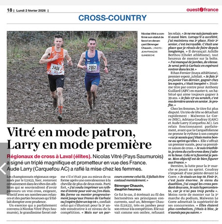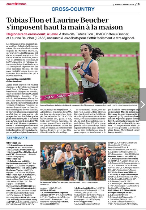 Belle réussite pour tous les bénévoles du L2A53 avec le soutien de la ligue des Pays de la Loire d’Athlétisme et du Comité départemental 53 avec de superbes courses, un accueil très apprécié et des athlètes locaux qui ont répondu présents avec un joli doublé des féminines sur le cross court avec la victoire de Laurine BEUCHER et de l’équipe et la superbe seconde place du senior Bérenger CHAUVIN sur le cross long …