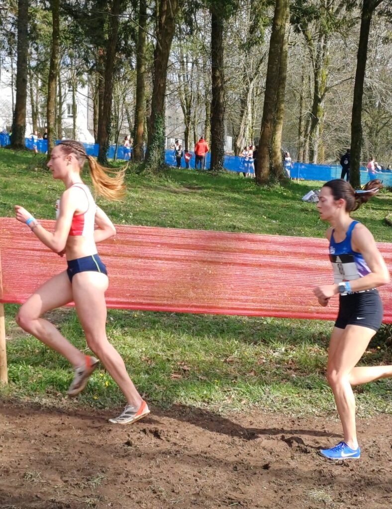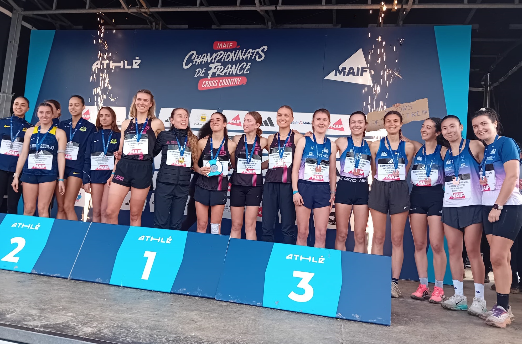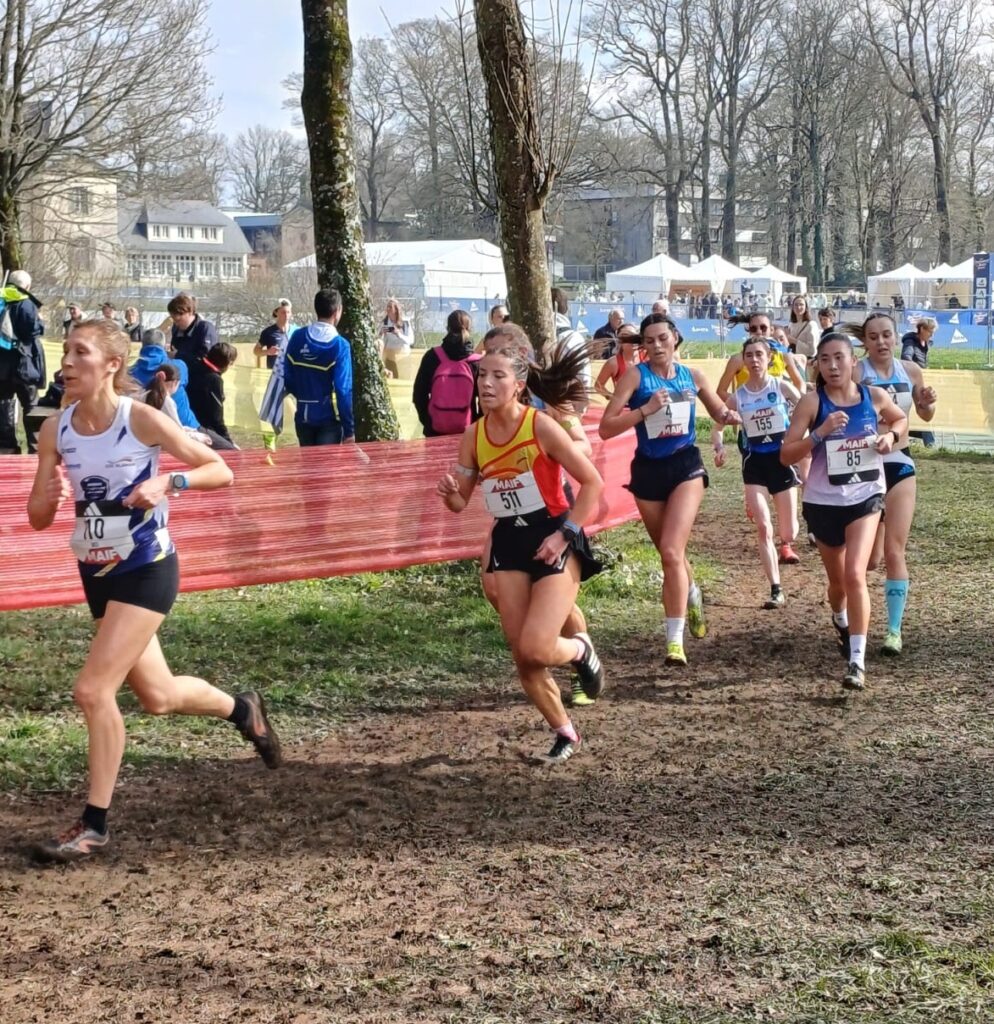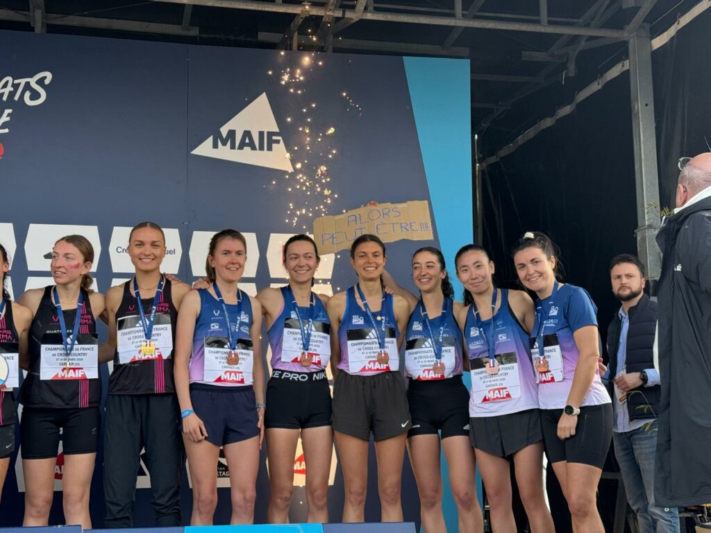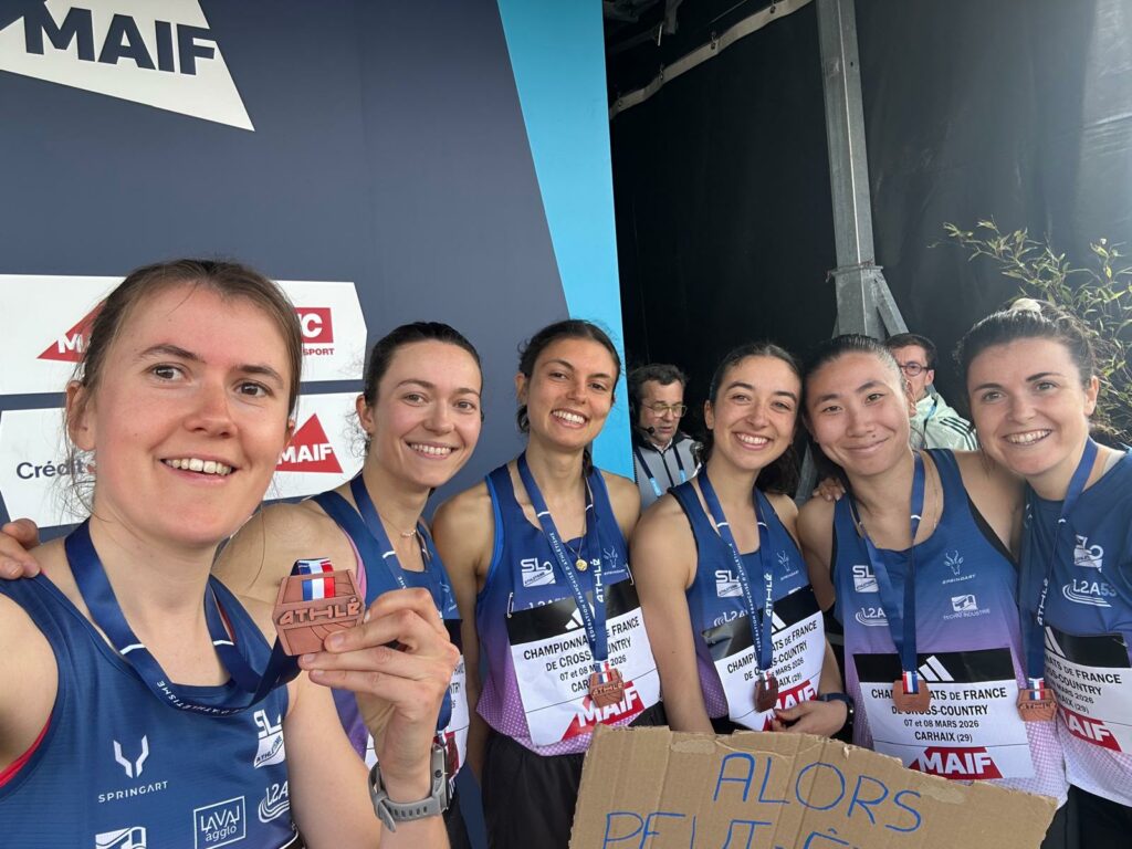 Cela va devenir une vrai tradition de ne jamais rentrer bredouille de Bretagne lors d’un Championnat de FRANCE de cross-country pour les athlètes du L2A53/Stade Lavallois Athlétisme ! En effet après 2023 et la superbe médaille d’argent par équipe assez inattendue de nos MASTERS , c’est l’équipe féminine sur cross court qui a arrachée une belle médaille de bronze avec une course dantesque de Laurine BEUCHER qui après un départ de feu alors qu’elle hésitait à se hisser dans le SAS Elites sur la ligne de départ du fait de son titre interrégional. En remontant ses adversaires une à une en se plaçant vers la 12ème place à l’issue de la 1ere boucle pour finir bagarre pour les places de 4 à 6 sur le final à l’issue de la dernière bosse du parcours à 300 m de l’arrivée, Laurine s’est octroyée une incroyable 7ème place au SCRATCH mais 5ème française (4ème senior) du fait qu’il y ait 2 athlètes de nationalité étrangère intercalées à seulement 13 petites secondes du podium ! Laurine TOUTIN , au prix d’une course très maîtrisée s’est arrachée dans les derniers mètres pour , à l’issue de son sprint , prendre une superbe 29ème place (27ème française). La médaille de bronze allait aussi se jouer sur les places de 3 & 4 et c’est là que Bérénice LERIOUX allait sortir le grand jeu du jour en étant bien présente sur ce parcours très sélectif de CARHAIX avec un sol boueux et collant mais plus sec que la veille. Pour celle qui n’apprécie pas plus que cela le cross et la boue , Bérénice a sorti le cross de sa saison au bon moment ! Et que dire de la course de Camille LEON , sans qui la médaille de bronze était également impossible, cette dernière s’étant jouée à 16 petits points. Partie prudemment , Camille a su géré son effort pour remonter ses adversaires et livrer un sprint final dont elle en a pas forcément l’habitude avec une 106ème place à la clé , alors qu’à ce niveau de course ce sont des paquets d’athlètes qui bataillent pour grappiller des places pour leur équipe . Pour compléter la fête , Yaelle GAUTHIER et Laurène CANTIN ont pris les 272ème et 313ème places sur 349 athlètes classées …