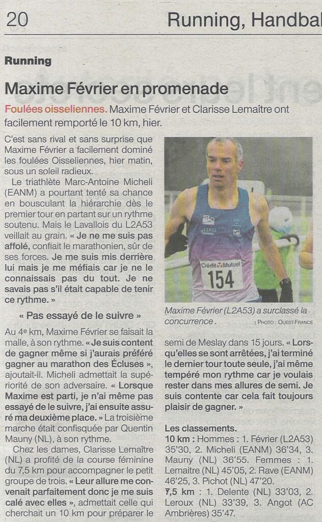 Victoire à sa main de Maxime FEVRIER en 35’30 sur les foulées Oisseliennes 8 jours avec sa place de 4ème au Marathon des écluses de la Mayenne en 2h36’32