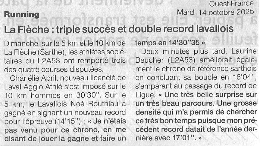 Avec Noé ROUTHIAU 19ème en 29’52-Record perso (22 athlètes chronométrés sous les 30 minutes !) et Laurine BEUCHER sur le podium avec une 3ème place en 33’37 avec un record personnel pas très éloigné du Record départemental détenu par une certaine Nicole LEVEQUE ex USL (en 33’16 à St MEDARD en 1994 !)