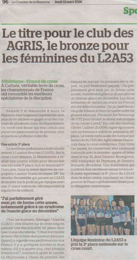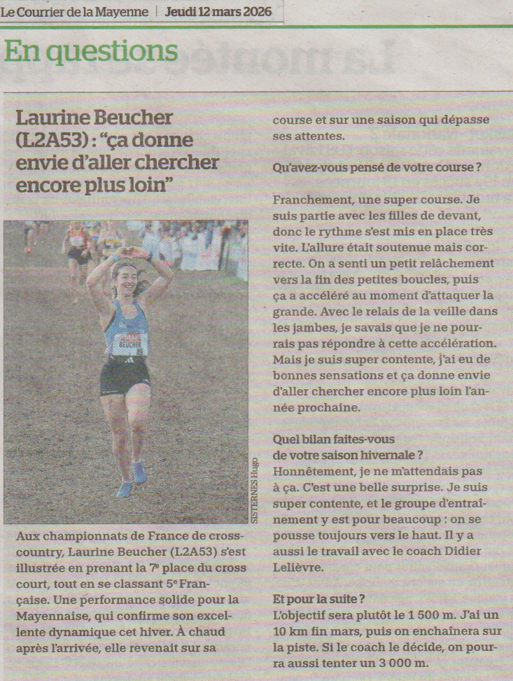 Belle réussite pour tous les bénévoles du L2A53 avec le soutien de la ligue des Pays de la Loire d’Athlétisme et du Comité départemental 53 avec de superbes courses, un accueil très apprécié et des athlètes locaux qui ont répondu présents avec un joli doublé des féminines sur le cross court avec la victoire de Laurine BEUCHER et de l’équipe et la superbe seconde place du senior Bérenger CHAUVIN sur le cross long …